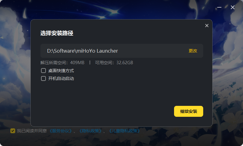 如果必要的话,你可以点击 “自定义安装” 选项,点击 “更改” ,选择你想安装启动器的盘符及位置,选择完毕后鼠标移动至 “继续安装” 按钮以开始安装(图5)(只有一个盘符或少点麻烦的请忽略此NOTE) (图5 - 自定义安装位置)