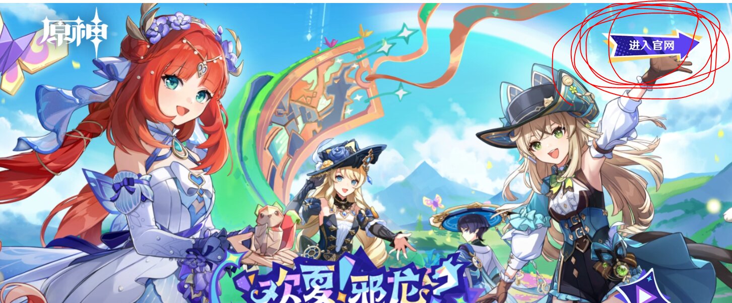 • 在网站中找到 “进入官网” 字样的文字,鼠标移动至此处并单击鼠标左键以跳转(图2),随后在跳转的页面下方找到 “PC下载” 按钮(图3),鼠标移动至此处并单击鼠标左键以开始下载任务,然后等待其下载完成 (图2 - 进入官网,该页面因不同版本而回产生不同,请以实际页面而准(其实可以在该页面下方找到 “PC下载” 的按钮,鼠标移动至那处并单击鼠标左键以下载)) (图3 - 在官网下载米哈游启动器)