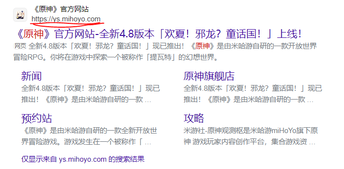• 在浏览器中的那搜索引擎搜索“原神”,然后单击键盘的回车键以开始搜索,然后找到其官网。或者点击此处链接:https://ys.mihoyo.com/main/ (图1 - 《原神》官方网站)